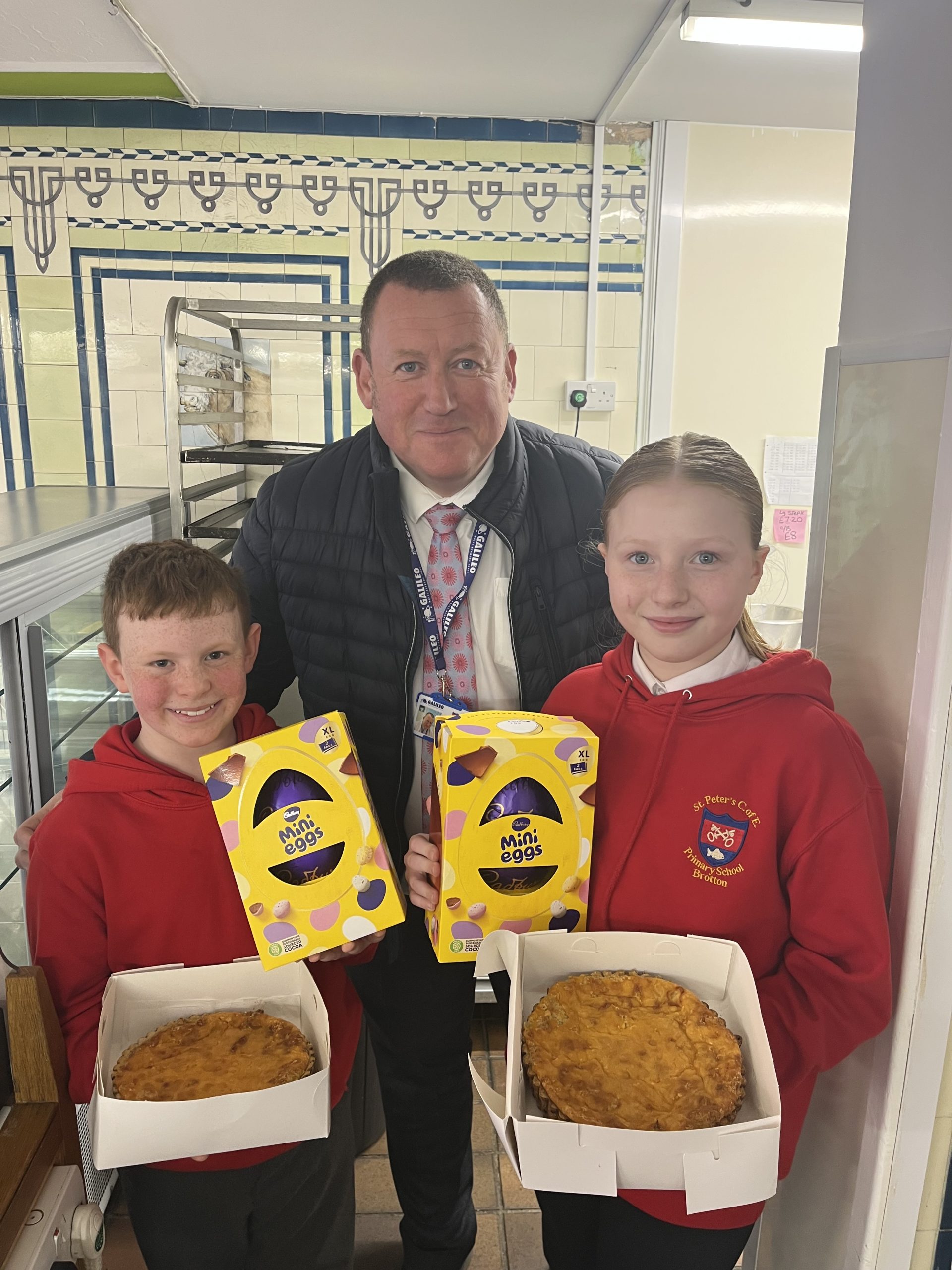 John also presented each of the winners with an Easter egg and provided two large winning pies for their classmates to enjoy back at school.